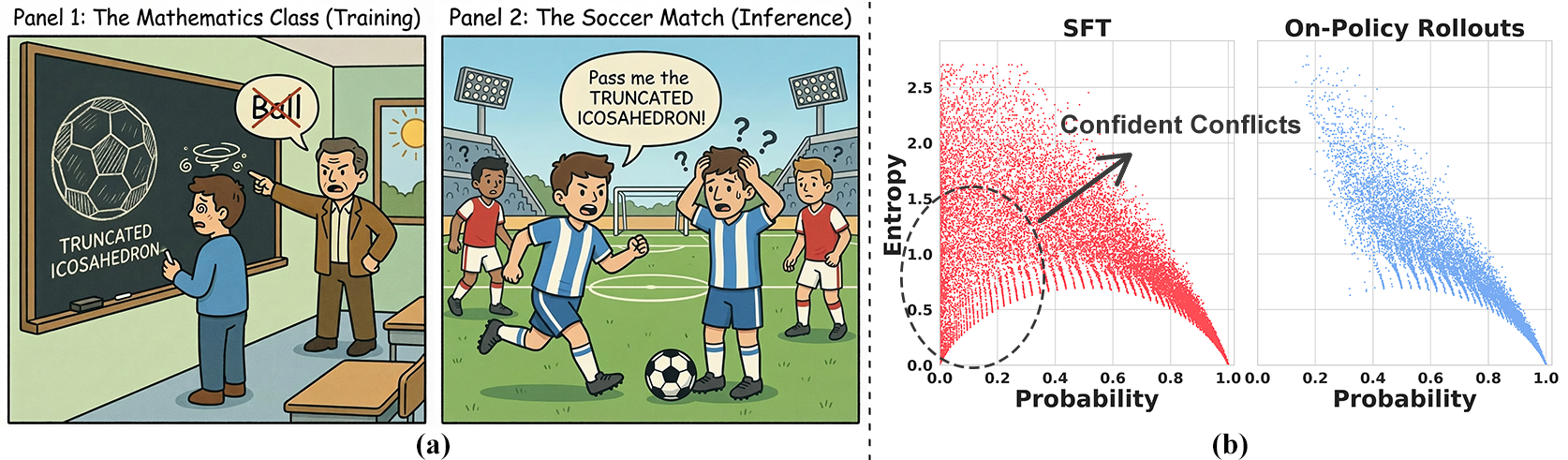 (a) Conceptual illustration. When SFT forces the model to override its strong priors, it creates a Confident Conflict. Fitting these conflicts distorts the model's existing representations, leading to catastrophic forgetting. (b) Token-level entropy-probability landscape. Compared to on-policy rollouts (right), the SFT data (left) exhibits a prominent cluster of Low Entropy, Low Probability tokens.
