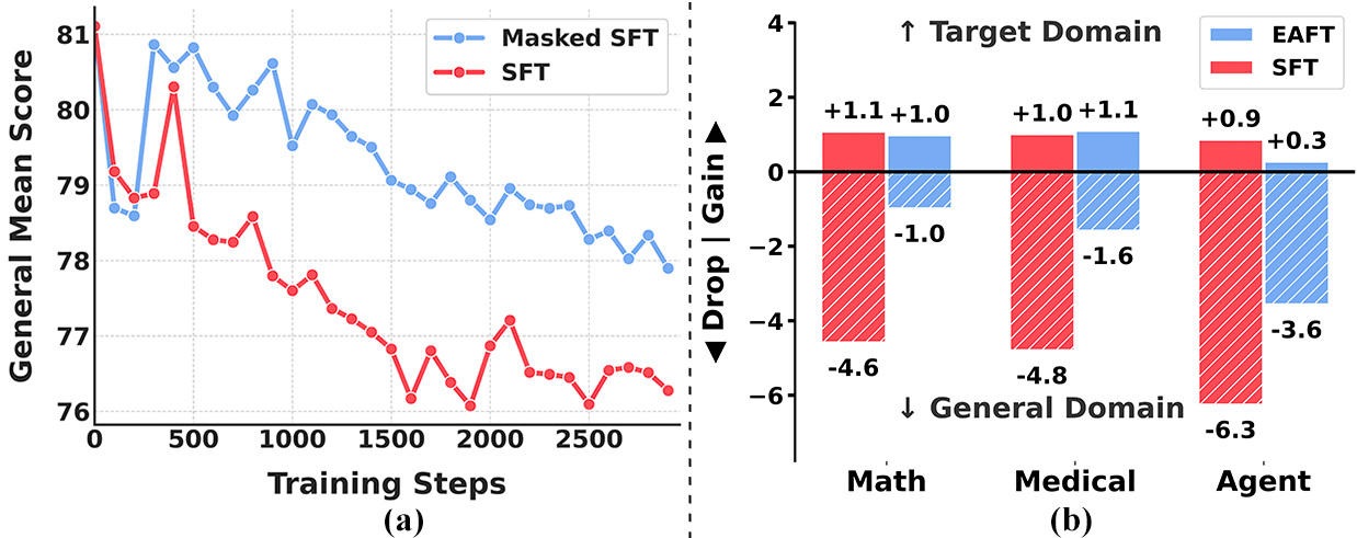 - 4. EAFT achieves Pareto improvement across diverse domains. Experiments on Qwen and GLM series (4B-32B parameters) across mathematical, medical, and agentic domains show that EAFT consistently matches the downstream performance of standard SFT while mitigating the degradation of general capabilities.